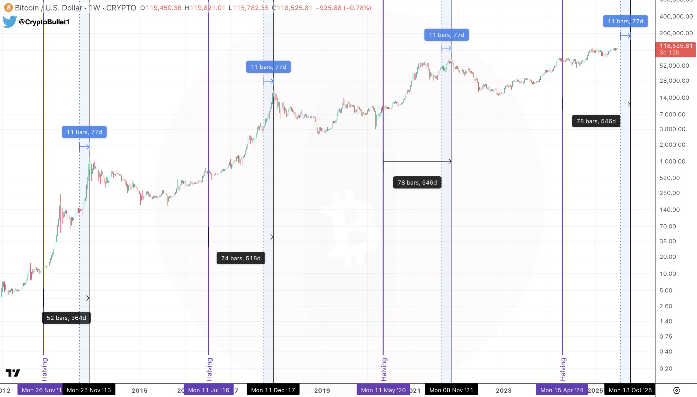 Một mô hình fractal lặp lại theo chu kỳ, được gọi là “tick-tock” do nhà phân tích CryptoBullet theo dõi, cho thấy rằng Bitcoin thường đạt đỉnh trong khoảng 518 đến 546 ngày sau mỗi lần halving. Lần halving gần nhất diễn ra vào ngày 15 tháng 4 năm 2024.