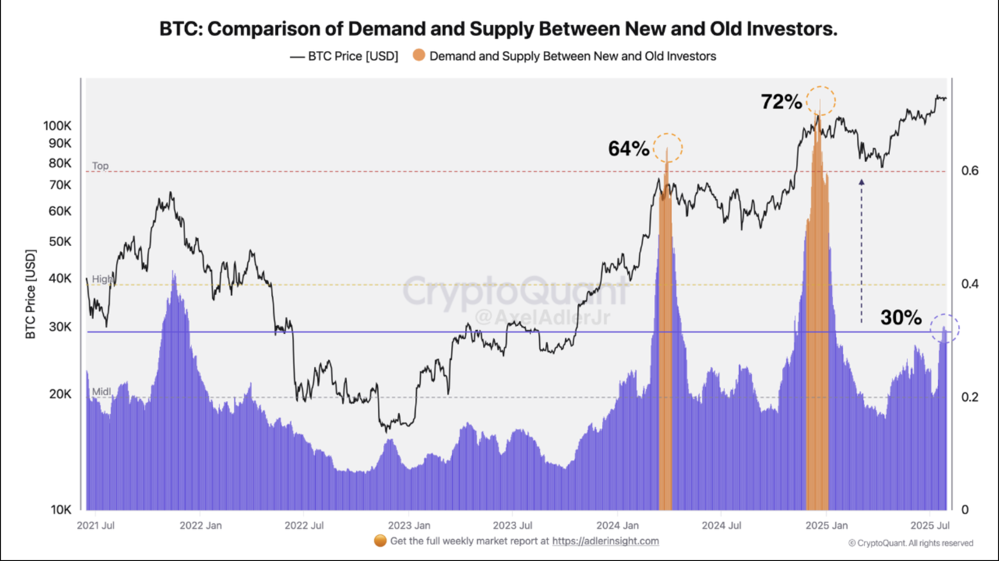 Một số liệu quan trọng so sánh hoạt động của các nhà đầu tư mới và cũ, do nhà phân tích Axel Adler Jr. của CryptoQuant công bố, cho thấy các đồng tiền mới, đại diện cho những người mua gần đây, hiện chiếm 30% tổng hoạt động của thị trường.