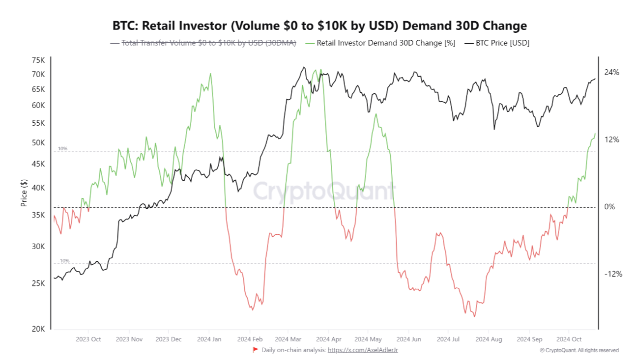 Ông cho biết: “Trong 30 ngày qua, nhu cầu bán lẻ đã tăng khoảng 13%, làm nổi bật kịch bản chỉ xảy ra vào tháng 3, khi Bitcoin gần đạt mức ATH”.