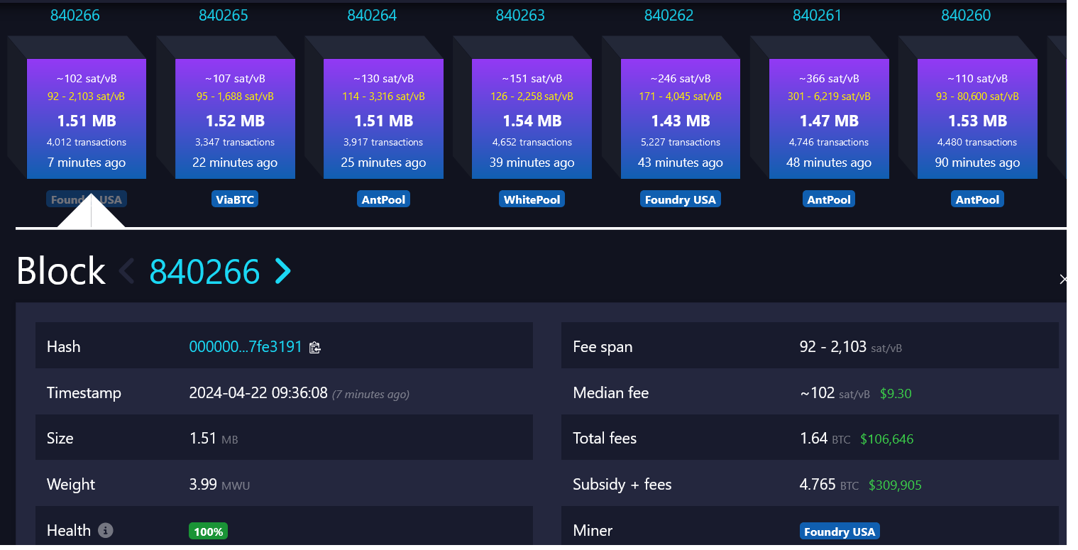 Ngày này bao gồm số tiền đáng kinh ngạc là 37,7 Bitcoin (2,4 triệu USDa) được trả cho thợ đào Bitcoin ViaBTC trong khối halving Bitcoin ở độ cao khối 840.000 – một kỷ lục.