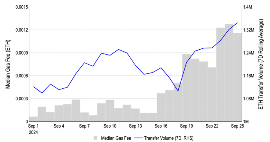 Ngoài ra, các nhà phân tích cho biết thêm, tổng khối lượng chuyển Ether đã tăng 17% so với tuần trước, tương ứng với mức phí giao dịch cao hơn.