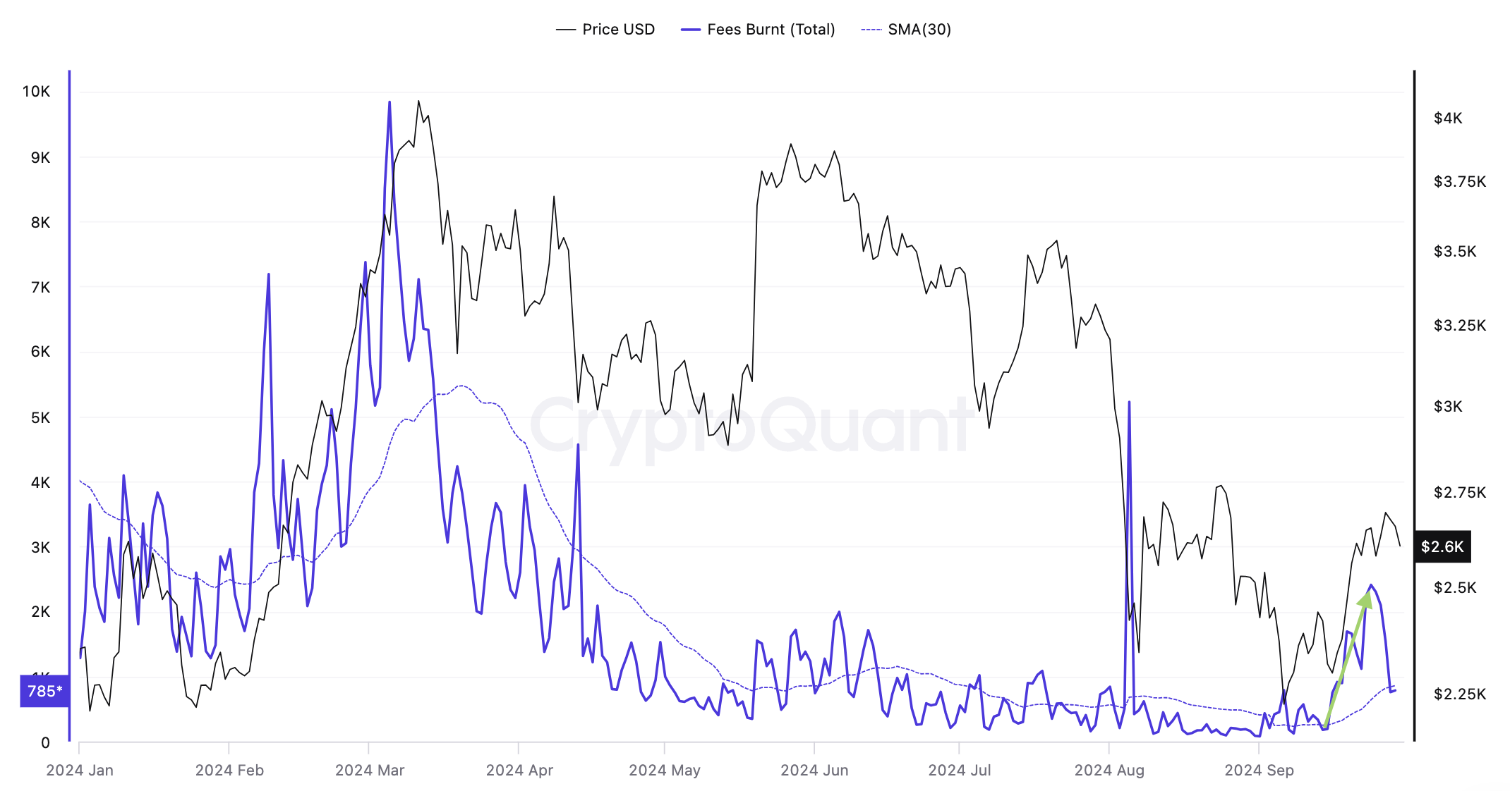 Hoạt động trên chuỗi và phí giao dịch tăng lên cũng khiến tổng số phí Ether bị đốt hàng ngày tăng đột biến, tăng hơn 900% lên 2.097 ETH từ ngày 14 tháng 9 đến ngày 24 tháng 9, theo dữ liệu từ CryptoQuant.