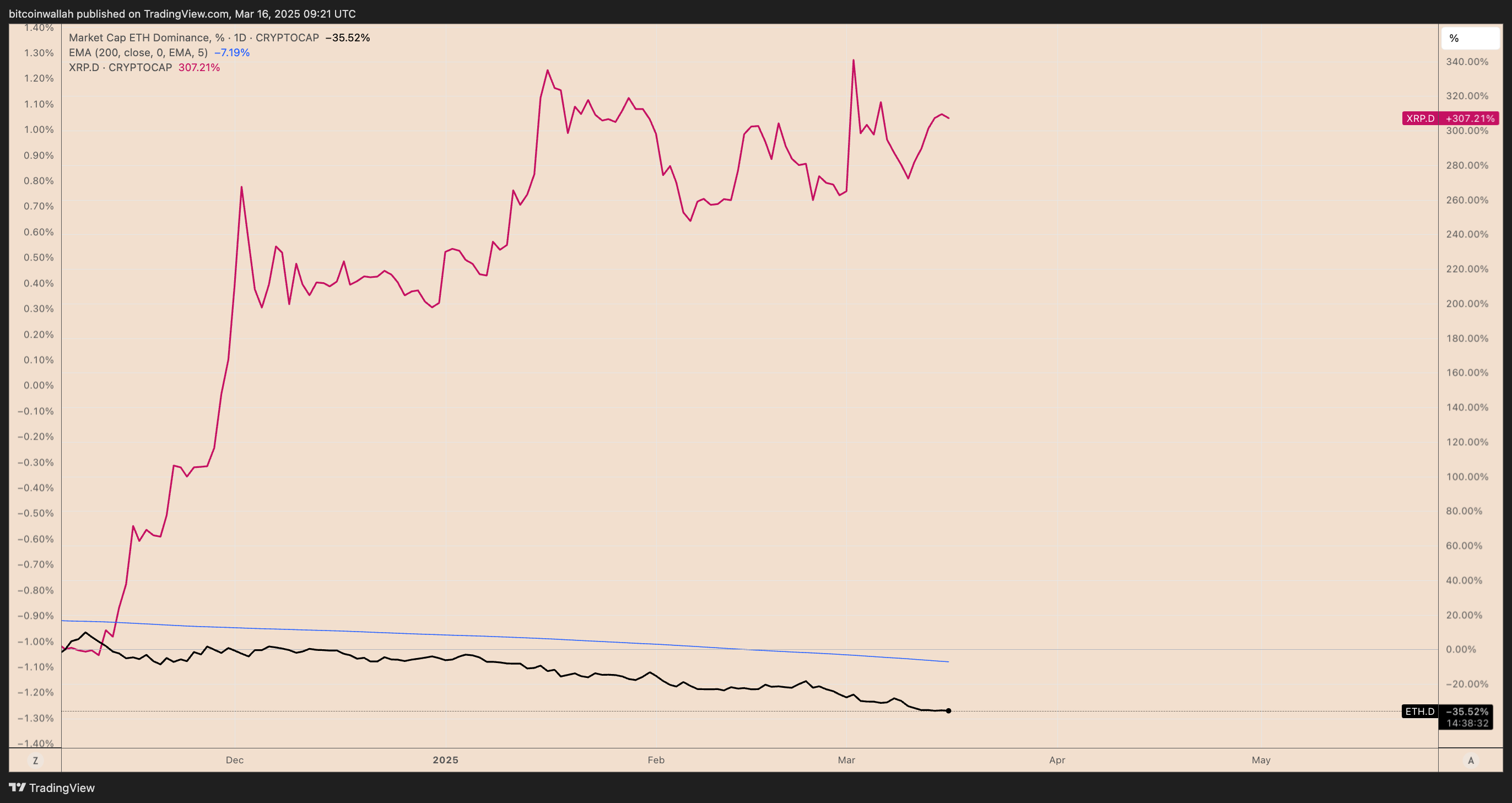 Tính đến ngày 16 tháng 3, XRP đã một lần nữa kiểm tra mức quan trọng này. Nếu lịch sử lặp lại, ngay cả một đợt tăng giá một phần 80% cũng đủ để XRP lật ngược ETH về vốn hóa thị trường, DOM cho biết, đặc biệt là khi giá Ether có nguy cơ giảm nhiều hơn vào năm 2025.