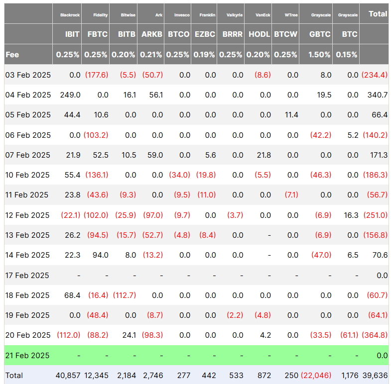 Tuy nhiên, các quỹ Bitcoin ETF đã trải qua một đợt bán tháo liên tiếp trong ba ngày gần đây, ghi nhận tổng số dòng tiền rút ròng lên đến hơn 364 triệu USD vào ngày 20 tháng 2, trong đó quỹ iShares Bitcoin Trust ETF (IBIT) của BlackRock chiếm 112 triệu USD, theo dữ liệu từ Farside Investors.