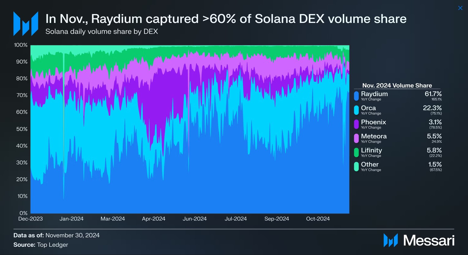 Báo cáo của Messari cho biết “thành công của Raydium phần lớn là nhờ vào sự thống trị của nó trong hệ sinh thái Solana”, đồng thời nói thêm rằng DEX luôn chiếm hơn 60% khối lượng DEX hàng ngày trên mạng blockchain layer-1.