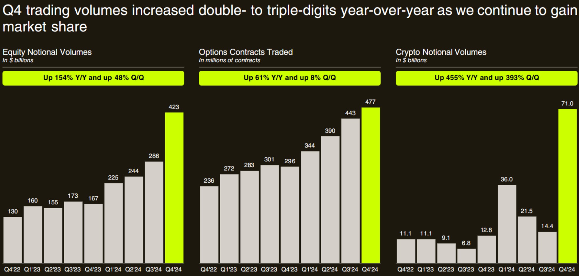 Sự thay đổi của Robinhood về khối lượng giao dịch cổ phiếu, hợp đồng quyền chọn và tiền điện tử. Nguồn: Robinhood.