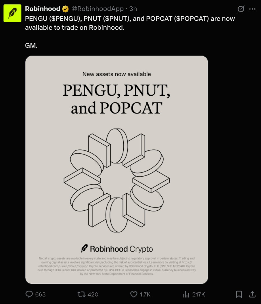 Robinhood niêm yết PENGU, POPCAT trong bối cảnh sự quan tâm đến tiền điện tử tăng mạnh