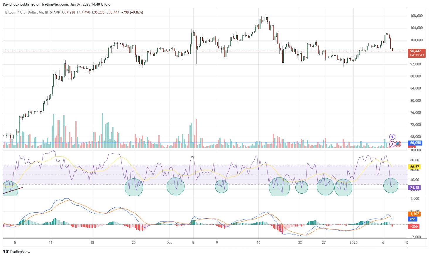 “Bitcoin đã đạt đến điểm quá bán tiếp theo của RSI(5) trên biểu đồ 6 giờ…”, nhà giao dịch David Cox tiếp tục nói về các chỉ số RSI khung thời gian thấp khác.