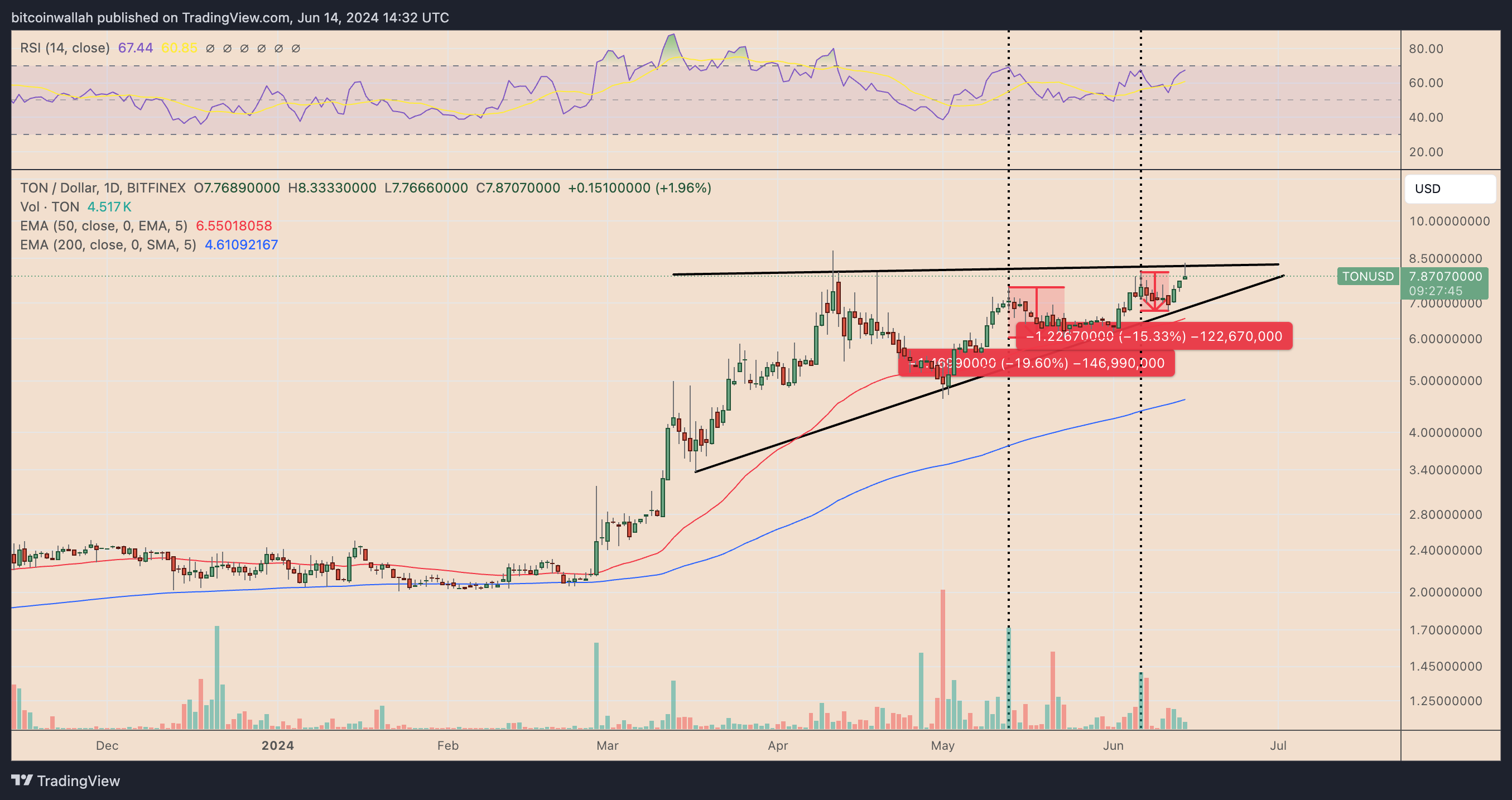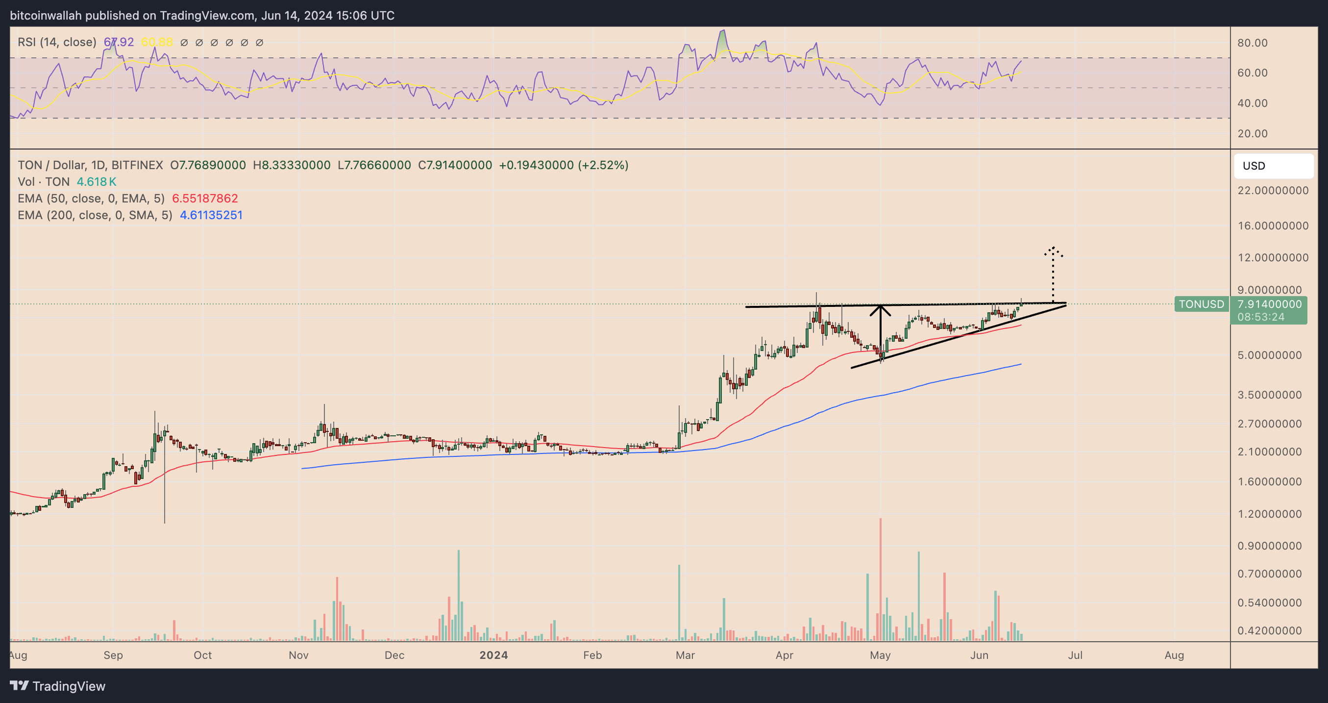 Trong phân tích kỹ thuật, một tam giác tăng dần sẽ hình thành sau khi giá vượt lên trên đường xu hướng trên và tăng lên bằng khoảng cách tối đa giữa đường xu hướng trên và dưới của nó. TON hiện đang tiến gần đến điểm đỉnh của tam giác, do đó làm tăng khả năng nó sẽ sớm có một bước đột phá.