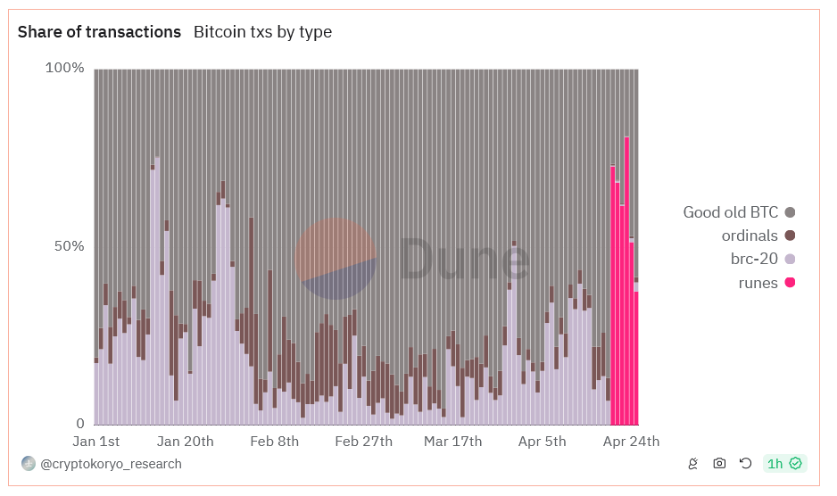 Theo dữ liệu Dune Analytics được chia sẻ bởi công ty nghiên cứu blockchain Crypto Koryo, hơn 2,38 triệu giao dịch Runes đã được xử lý, chiếm 68% tổng số giao dịch Bitcoin được thực hiện kể từ khi nó ra mắt vào ngày 20 tháng 4.