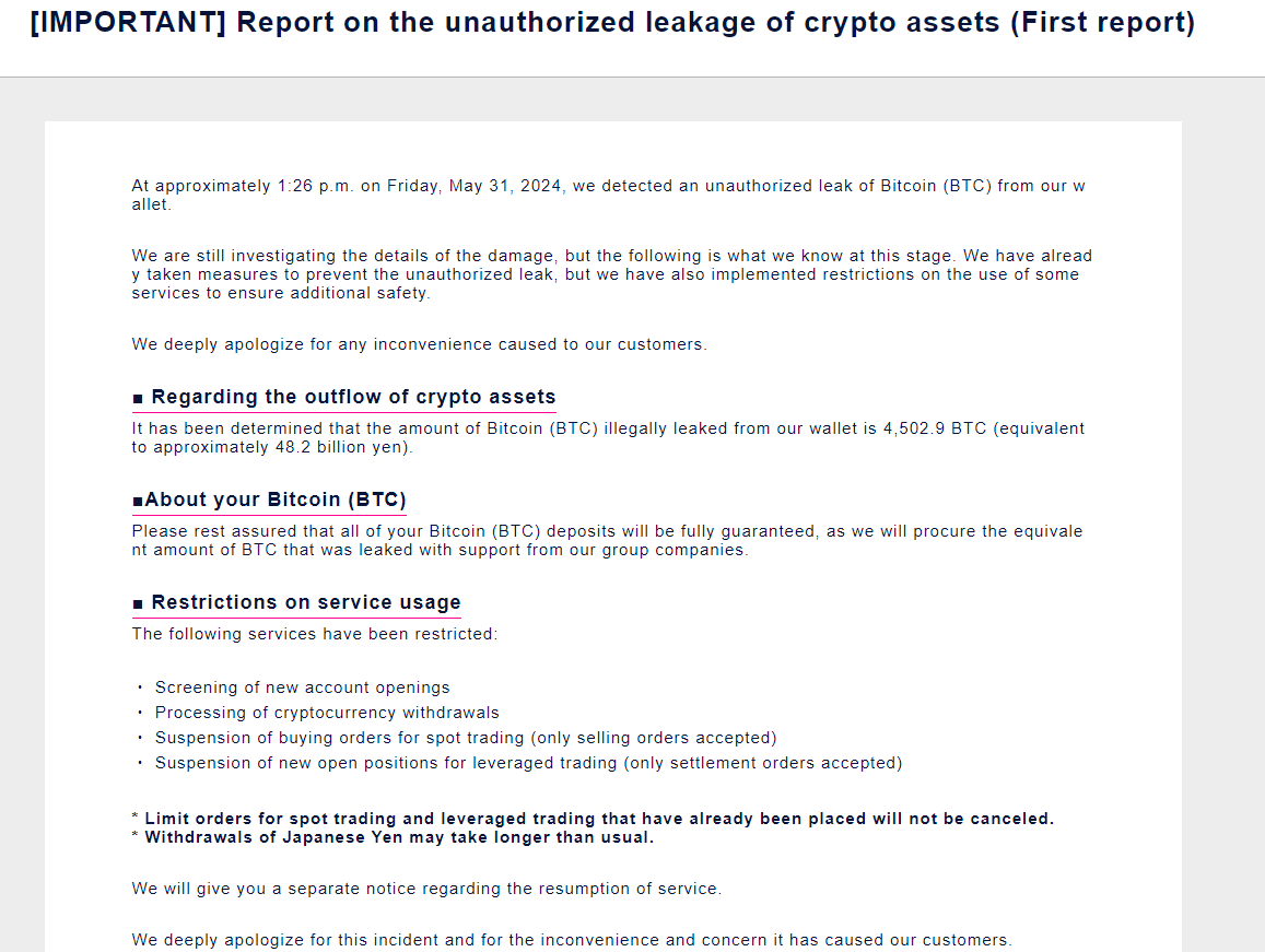 Sàn giao dịch cho biết họ “đã thực hiện các biện pháp để ngăn chặn sự rò rỉ trái phép”. DMM sẽ “mua số lượng BTC tương đương” để đảm bảo rằng tất cả người dùng đều được bồi thường. Những khoản tiền này sẽ được mua lại “với sự hỗ trợ từ các công ty trong tập đoàn của chúng tôi”.