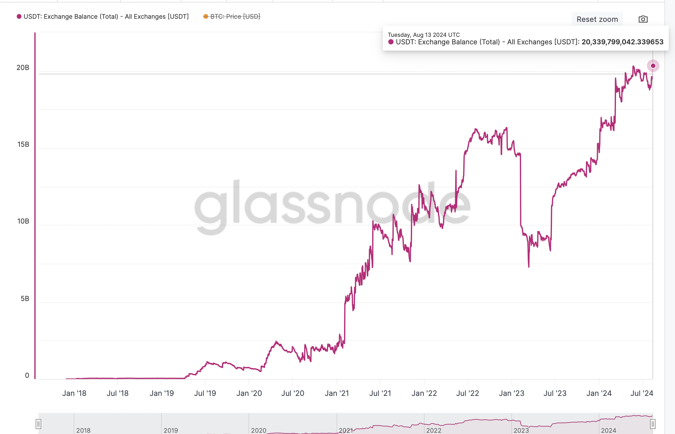 Số dư USDT trên các sàn giao dịch tiền điện tử đạt mức cao kỷ lục là 20,339 tỷ vào ngày 13 tháng 8, báo hiệu các nhà đầu tư đang chuẩn bị triển khai stablecoin này vào tài sản tiền điện tử trước quyết định lãi suất của Cục Dự trữ Liên bang Hoa Kỳ vào tháng 9.