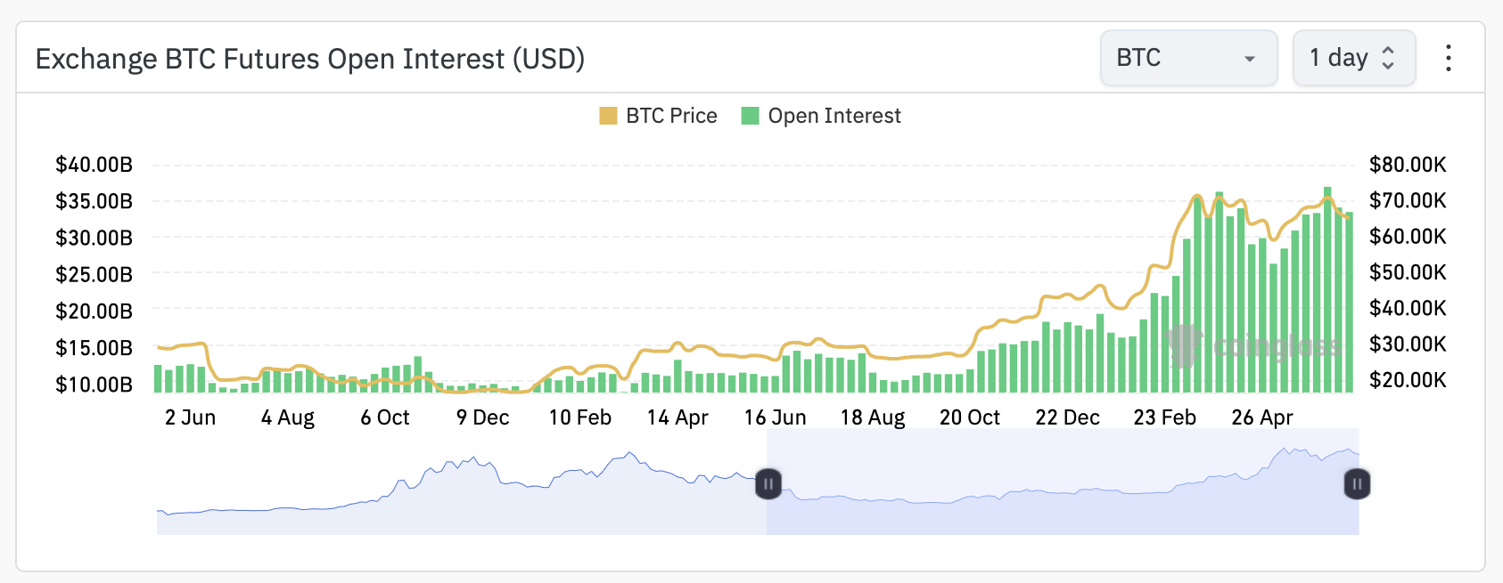 Lãi suất mở Bitcoin (OI) – là tổng giá trị của tất cả các hợp đồng tương lai Bitcoin chưa thanh toán – đã giảm 10,99% kể từ khi đạt mức cao nhất mọi thời đại vào ngày 7 tháng 6 xuống còn 33,55 tỷ USD.