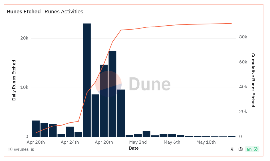 Sự sụt giảm diễn ra sau chuỗi thành công rực rỡ diễn ra một tuần sau khi ra mắt, với trung bình 14.700 Runes mới được khắc mỗi ngày trong khoảng thời gian từ 26 đến 30 tháng 4, bao gồm kỷ lục 23.061 được khắc vào ngày 26 tháng 4, theo bảng điều khiển Dune Analytics.