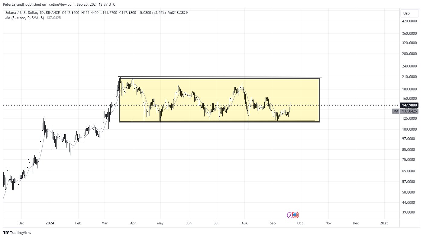 “Có vẻ như SOL đã giữ được mức hỗ trợ ở mức 120 USD”, nhà giao dịch kỳ cựu Peter Brandt đã viết trong bài đăng ngày 20 tháng 9. Brandt đang đề cập đến diễn biến giá của Solana trên biểu đồ hàng ngày, cho thấy sự hợp nhất của SOL trong một hình chữ nhật với giới hạn dưới của hình chữ nhật ở mức 120 USD đóng vai trò là mức hỗ trợ kể từ giữa tháng 4.