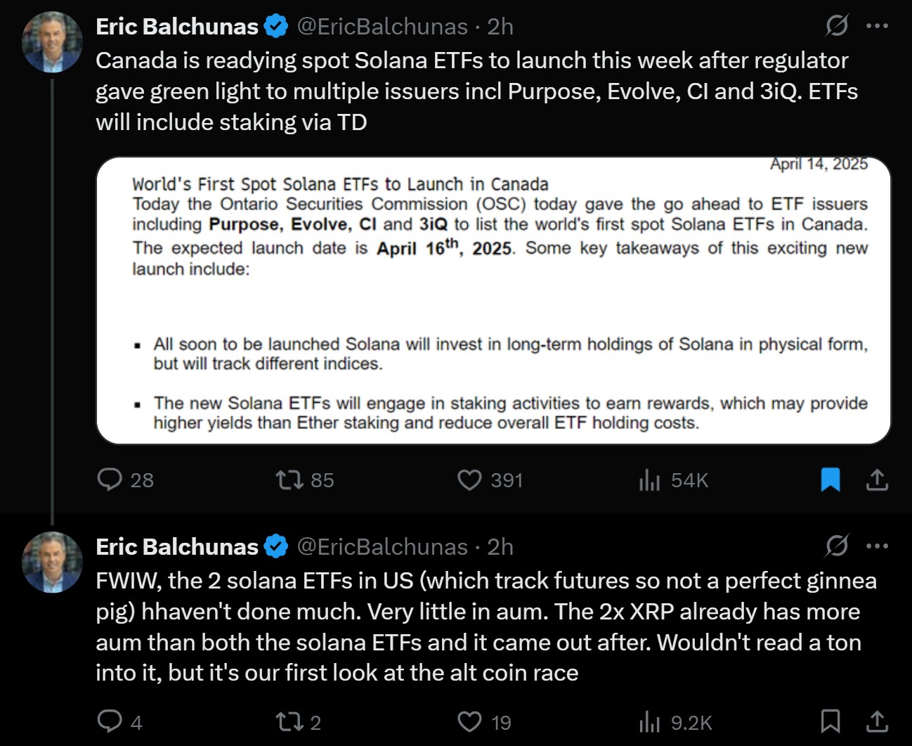 Theo nhà phân tích Eric Balchunas của Bloomberg, các quỹ Solana ETF dự kiến sẽ ra mắt tại Canada vào ngày 16 tháng 4.