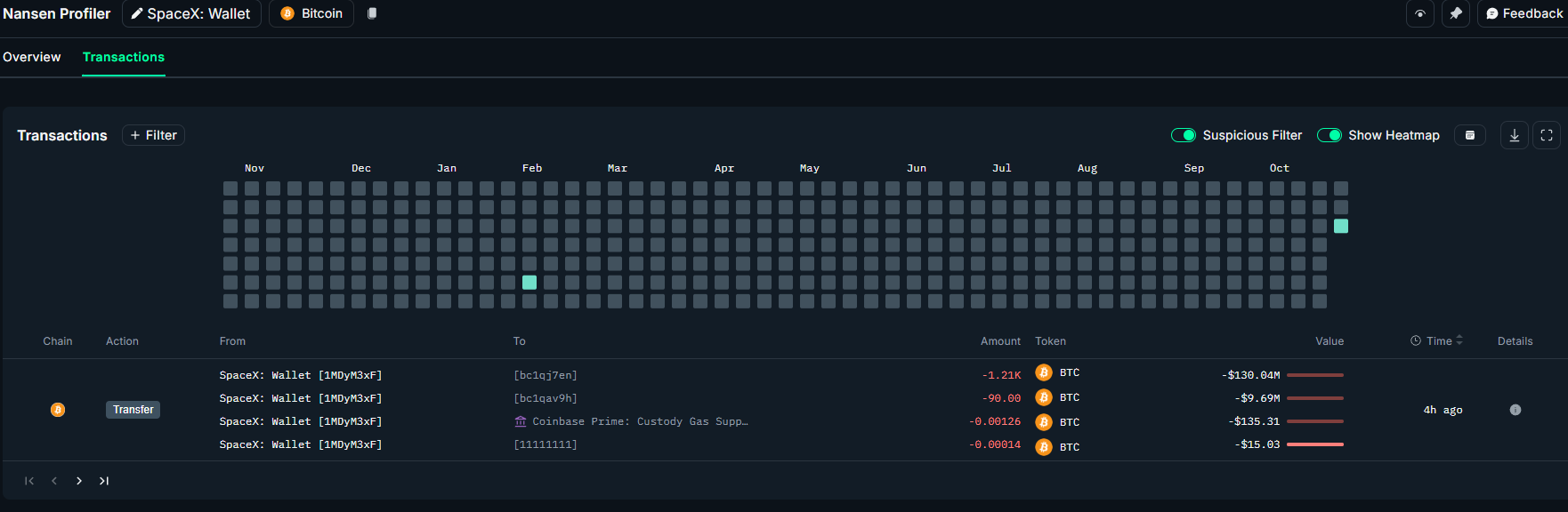 Ví mang nhãn SpaceX “1MDyM” đã chuyển 130 triệu USD Bitcoin đến địa chỉ “bc1qj”, trong khi một ví SpaceX khác “1AXeF” đã gửi 127 triệu USD Bitcoin đến địa chỉ “bc1qq”, theo dữ liệu từ nền tảng thông tin blockchain Nansen.