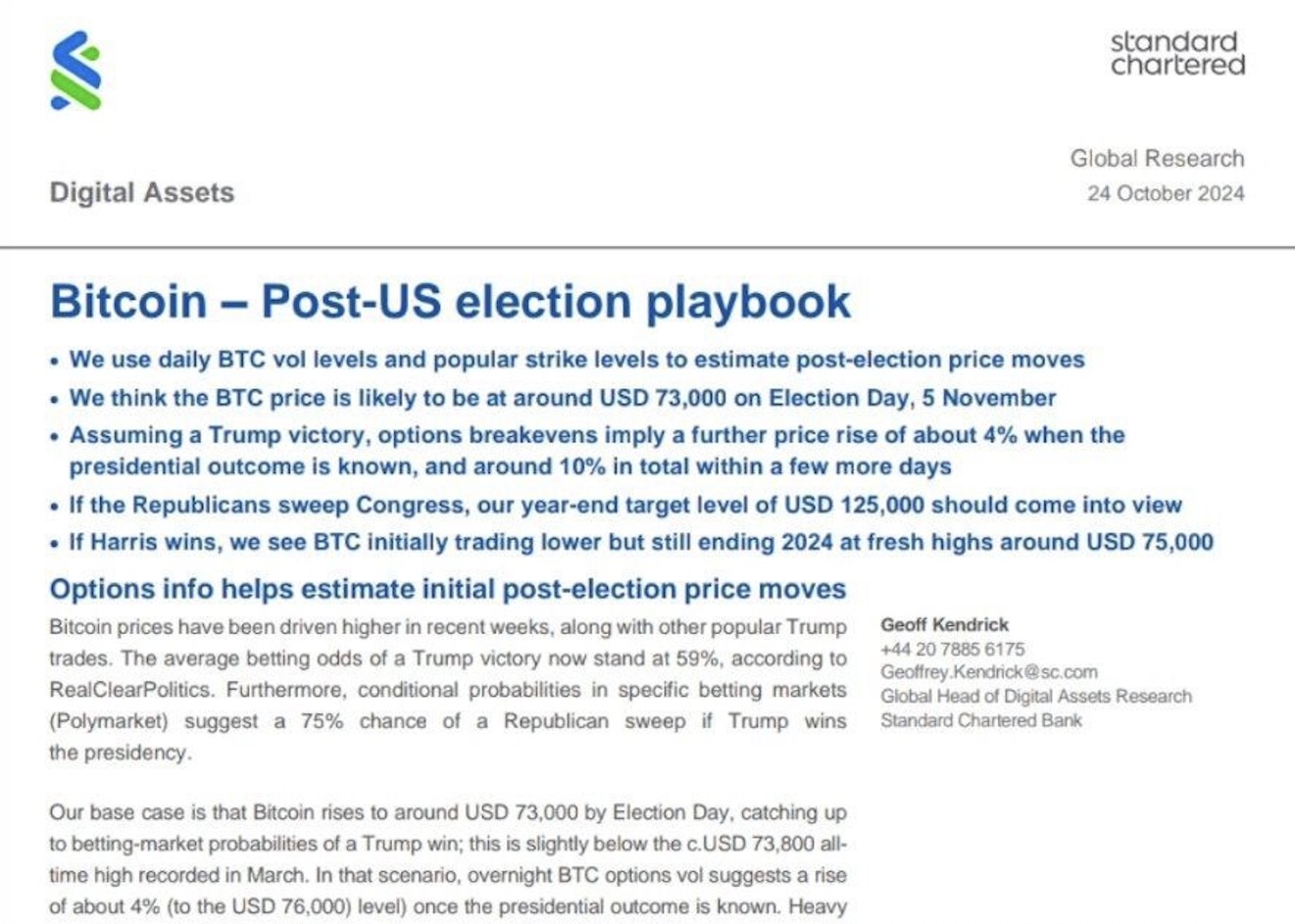 Nhà phân tích Geoff Kendrick của Ngân hàng Standard Chartered dự đoán giá Bitcoin có thể đạt 125.000 USD vào cuối năm nếu các thành viên của Đảng Cộng hòa chiếm ưu thế tại Quốc hội Hoa Kỳ sau cuộc bầu cử ngày 5 tháng 11.