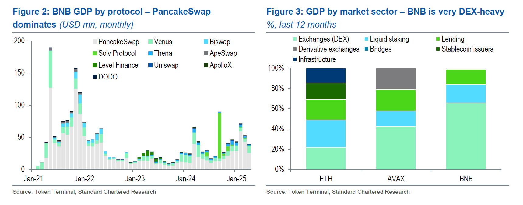 Standard Charter cho biết BNB Chain có ít hoạt động của nhà phát triển hơn các L1 như Ethereum hoặc Avalanche và hệ sinh thái của nó tương đối “cũ kỹ”.