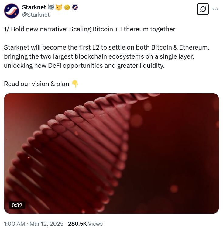 Trong lộ trình Bitcoin ngày 11 tháng 3, Starknet Foundation cho biết họ đang hướng tới mục tiêu biến Starknet trở thành lớp thực thi của Bitcoin, mở rộng quy mô từ 13 giao dịch mỗi giây lên hàng nghìn, giảm khối và phí gas, đồng thời tạo ra trải nghiệm người dùng tốt hơn.