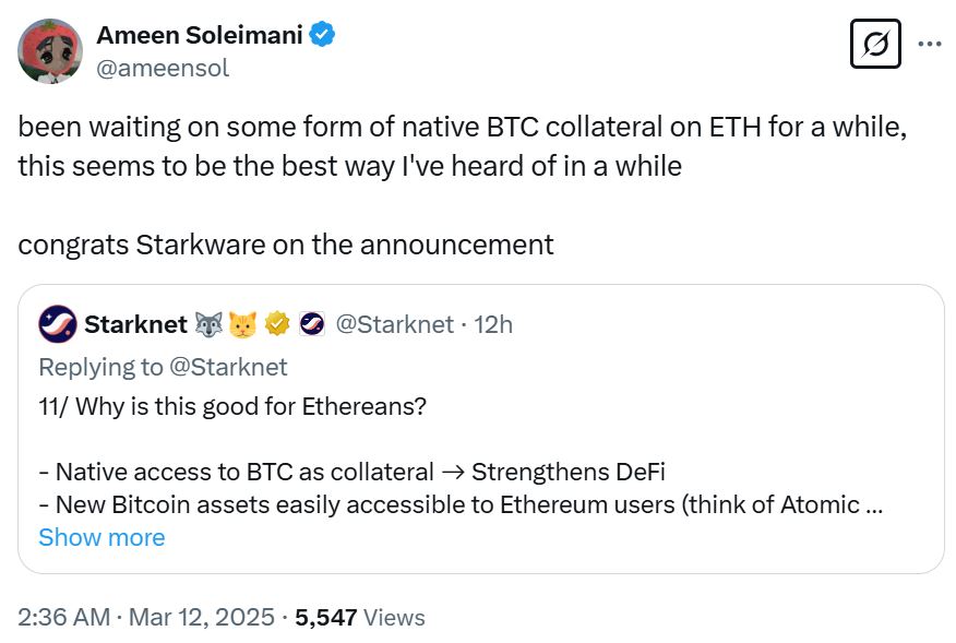 Starknet cũng sẽ hợp tác với ví Bitcoin Web3 Xverse, người sáng lập kiêm giám đốc điều hành Ken Liao cho biết việc tích hợp này, dự kiến diễn ra vào quý 2 năm 2025, sẽ tạo nên “khoảnh khắc cất cánh DeFi” của Bitcoin.