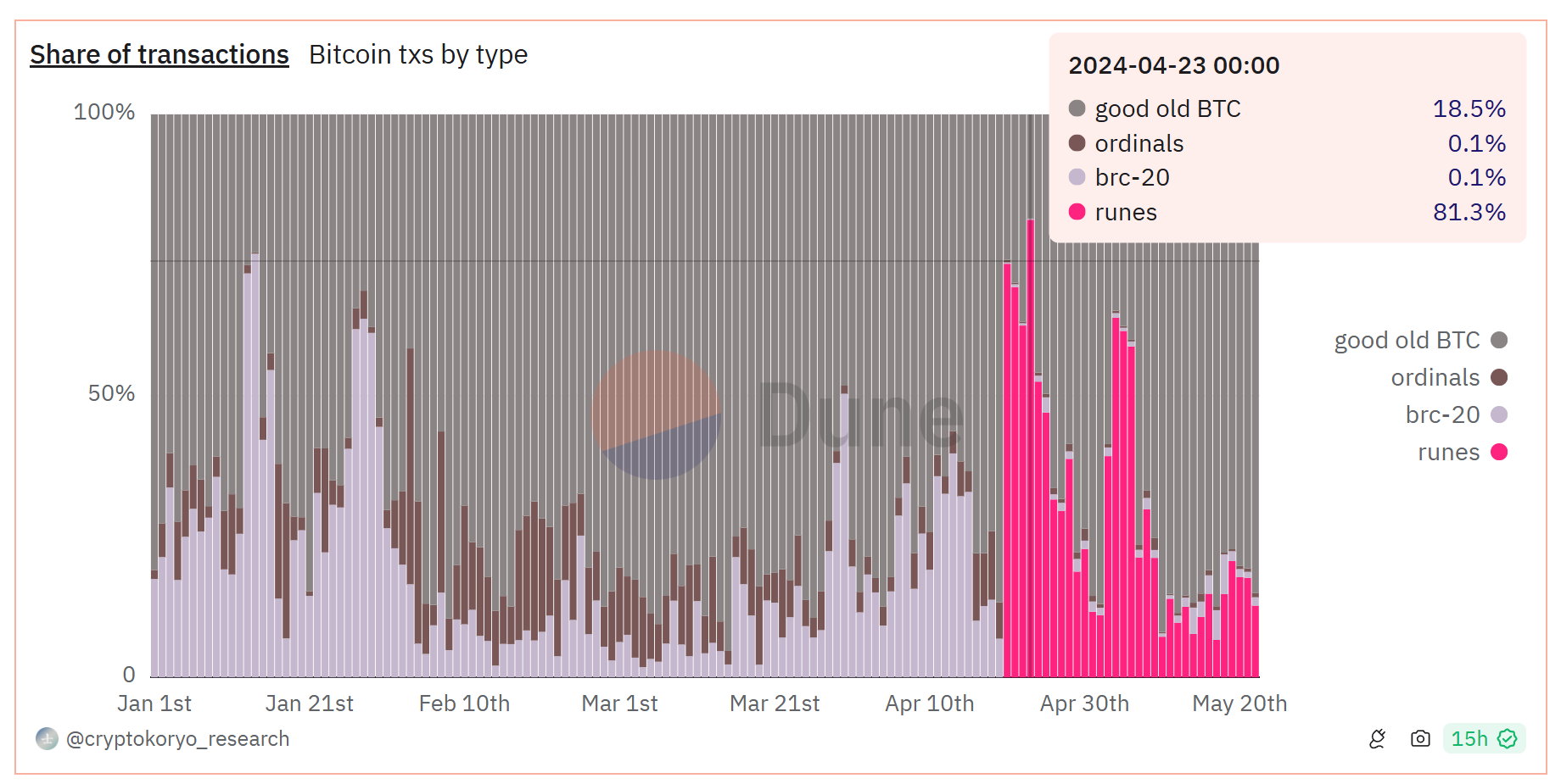 Tính đến ngày 22 tháng 5, Runes đại diện cho 12,7% giao dịch Bitcoin, cao hơn nhiều so với Bitcoin Ordinals (0,7%) và BRC-20 (1,5%). Phần còn lại thuộc về giao dịch BTC thông thường. Kết quả là số lượng giao dịch Rune giảm hơn 84% kể từ mức cao nhất mọi thời đại.
