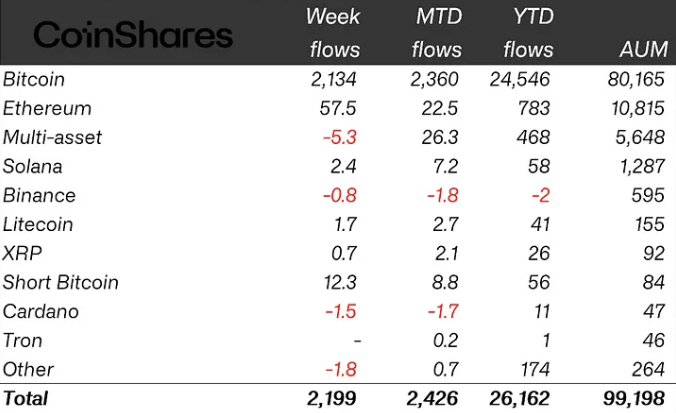Trong số các sản phẩm đầu tư tiền điện tử khác nhau, Bitcoin một lần nữa là người chiến thắng lớn nhất vào tuần trước, với 2,13 tỷ USD tiền chảy vào.