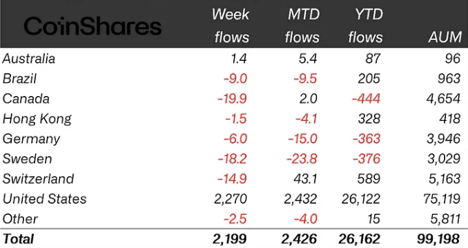 Hoa Kỳ dẫn đầu về sự gia tăng đầu tư vào sản phẩm tiền điện tử trong tuần từ ngày 12 đến ngày 18 tháng 10, với dòng tiền chảy vào đạt 2,3 tỷ USD. Các khu vực khác, bao gồm Canada và Thụy Điển, chứng kiến dòng tiền chảy ra lần lượt là 19,9 triệu USD và 18,2 triệu USD.