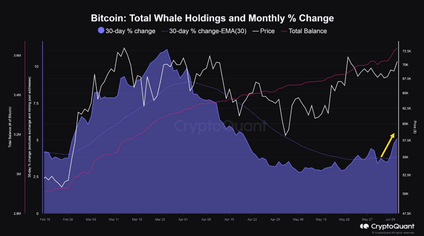 Tổng số Bitcoin nắm giữ của cá voi và phần trăm thay đổi hàng tháng Nguồn: CryptoQuant.