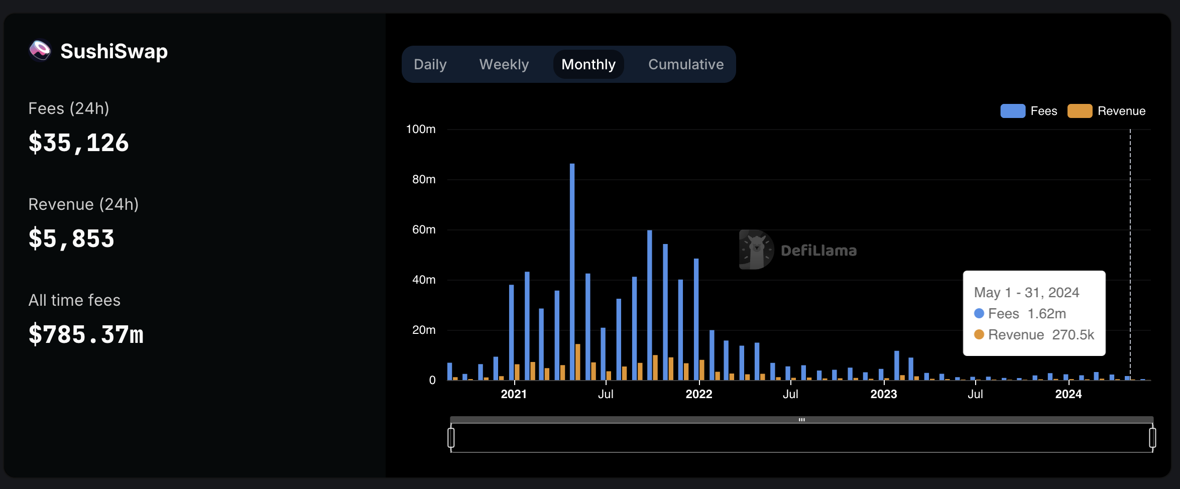 Theo dữ liệu từ DefiLlama, Sushi đã tạo ra 1,62 triệu USD phí trong tháng 5, với doanh thu 270.500 USD trong tháng – một mức giảm mạnh so với hiệu suất của nó trong chu kỳ tăng giá trước đó. Vào tháng 5 năm 2021, doanh thu của Sushi đạt 14,37 triệu USD sau khi tạo ra 86,24 triệu USD phí.