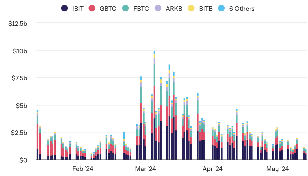 Tuy nhiên, dữ liệu từ The Block tiết lộ rằng khối lượng Bitcoin ETF spot đã liên tục giảm kể từ khi đạt đỉnh vào ngày 5 tháng 3.