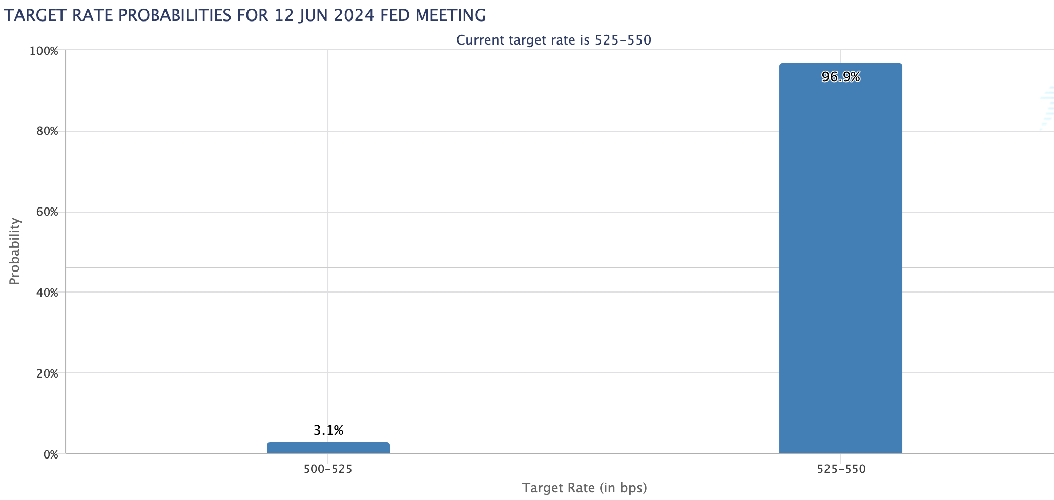 Theo công cụ FedWatch của CME, các nhà giao dịch đang đặt cược vào việc cắt giảm lãi suất vào tháng 6 ở mức chỉ 3,1% tại thời điểm viết bài. Điều này có nghĩa là những người tham gia thị trường đang đặt cược rằng ngân hàng trung ương Hoa Kỳ sẽ giữ lãi suất ổn định trong tháng 6 và tháng 7, với lần cắt giảm đầu tiên có thể xảy ra vào tháng 9 ở mức 53%.