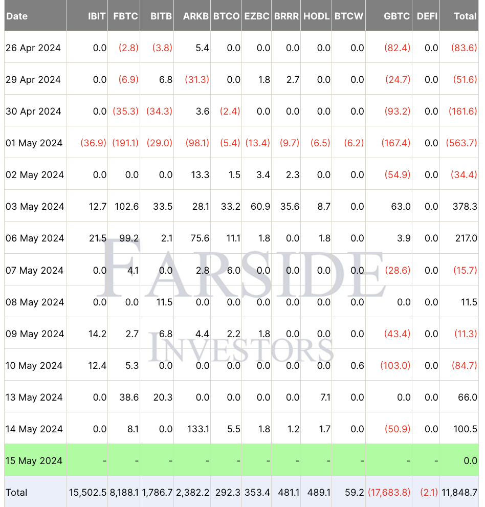 Dòng tiền tích cực đổ vào Bitcoin ETF spot cũng đang thúc đẩy tâm lý tăng giá mới nhất từ ​​các nhà đầu tư. Các quỹ Bitcoin ETF spot của Hoa Kỳ đã thu về dòng vốn ròng hàng ngày là 100,5 triệu USD vào ngày 14 tháng 5, trong đó Bitcoin ETF (ARKB) của ARK 21Shares ghi nhận dòng vốn vào lớn nhất trong ngày, vượt qua dòng vốn chảy ra từ Grayscale Bitcoin Trust.