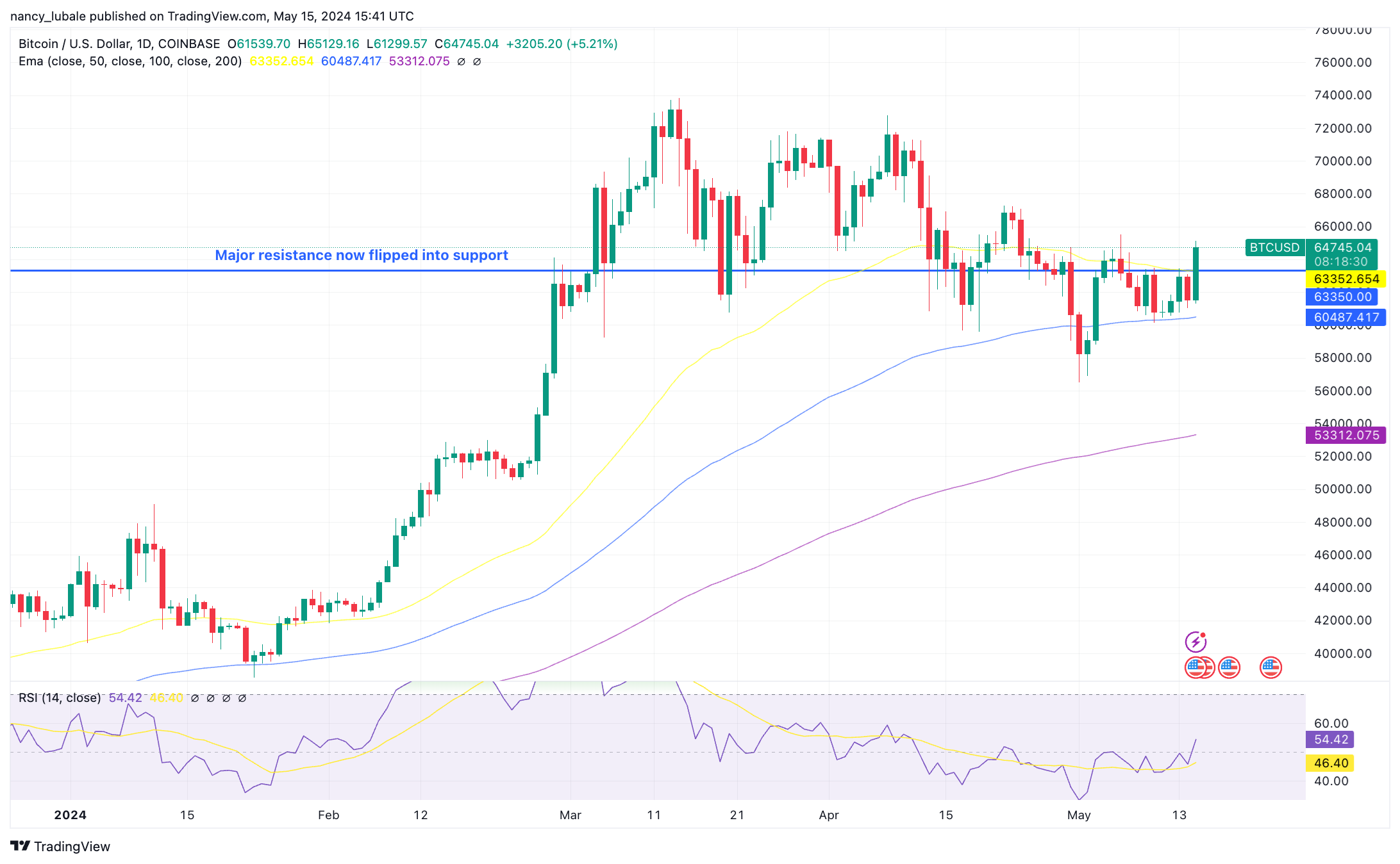 Giá Bitcoin (BTC) đã tăng lên 65.150 USD sau khi Phố Wall mở cửa vào ngày 15 tháng 5, khi thị trường phản ứng với dữ liệu Chỉ số giá tiêu dùng và tác động của nó đối với việc cắt giảm lãi suất tiềm năng vào năm 2024.