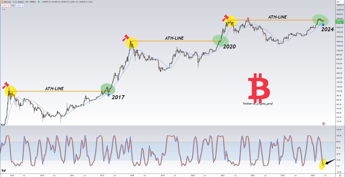 Nhà phân tích và nhà giao dịch Mustache đã đăng biểu đồ sau đây cho thấy chỉ báo Stochastic RSI đã tạo ra một giao cắt tăng giá trong khung thời gian hàng tuần.