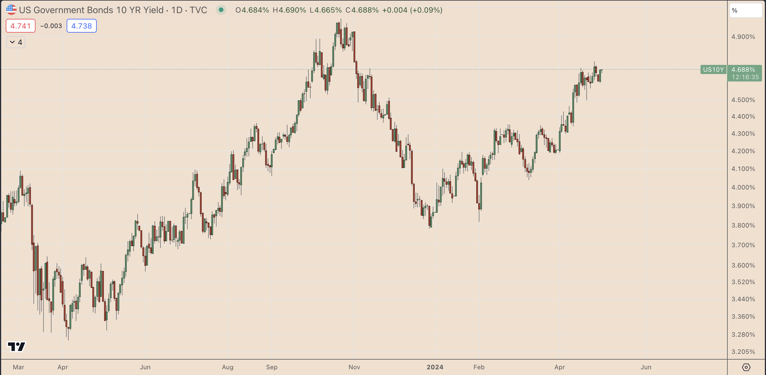 Những dự đoán về môi trường lãi suất cao kéo dài đã đẩy lãi suất trái phiếu kho bạc 10 năm của Mỹ lên 4,69% vào ngày 1 tháng 5, tăng từ mức 4,60% của một ngày trước đó.