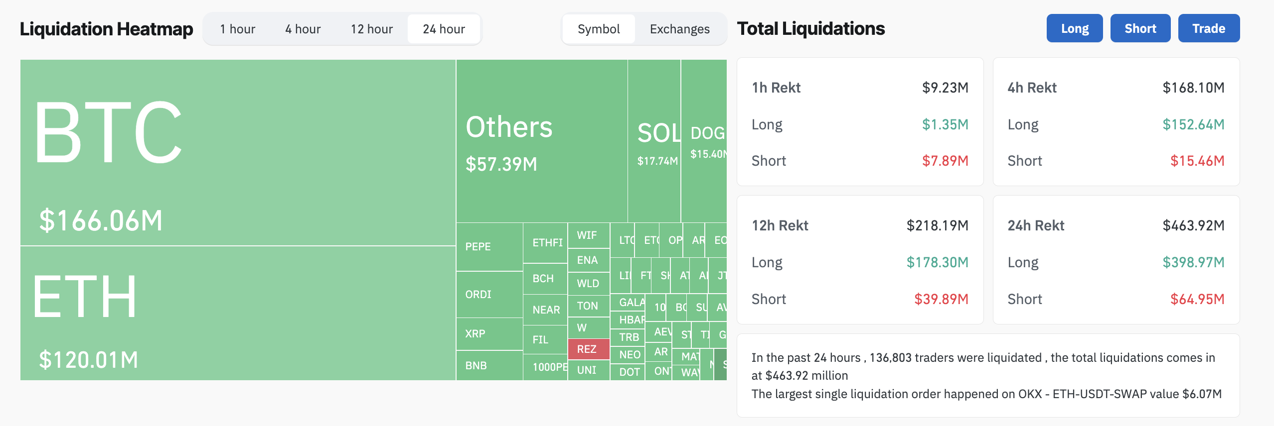 Đáng chú ý, thị trường phái sinh Bitcoin đã chứng kiến sự thanh lý trị giá hơn 166 triệu USD trong 24 giờ qua, trong đó 145,35 triệu USD là vị thế long. Khi các vị thế long được thanh lý, nó thường liên quan đến việc bán bớt tài sản (tự nguyện hoặc bởi người môi giới), điều này có thể khiến giá giảm hơn nữa.
