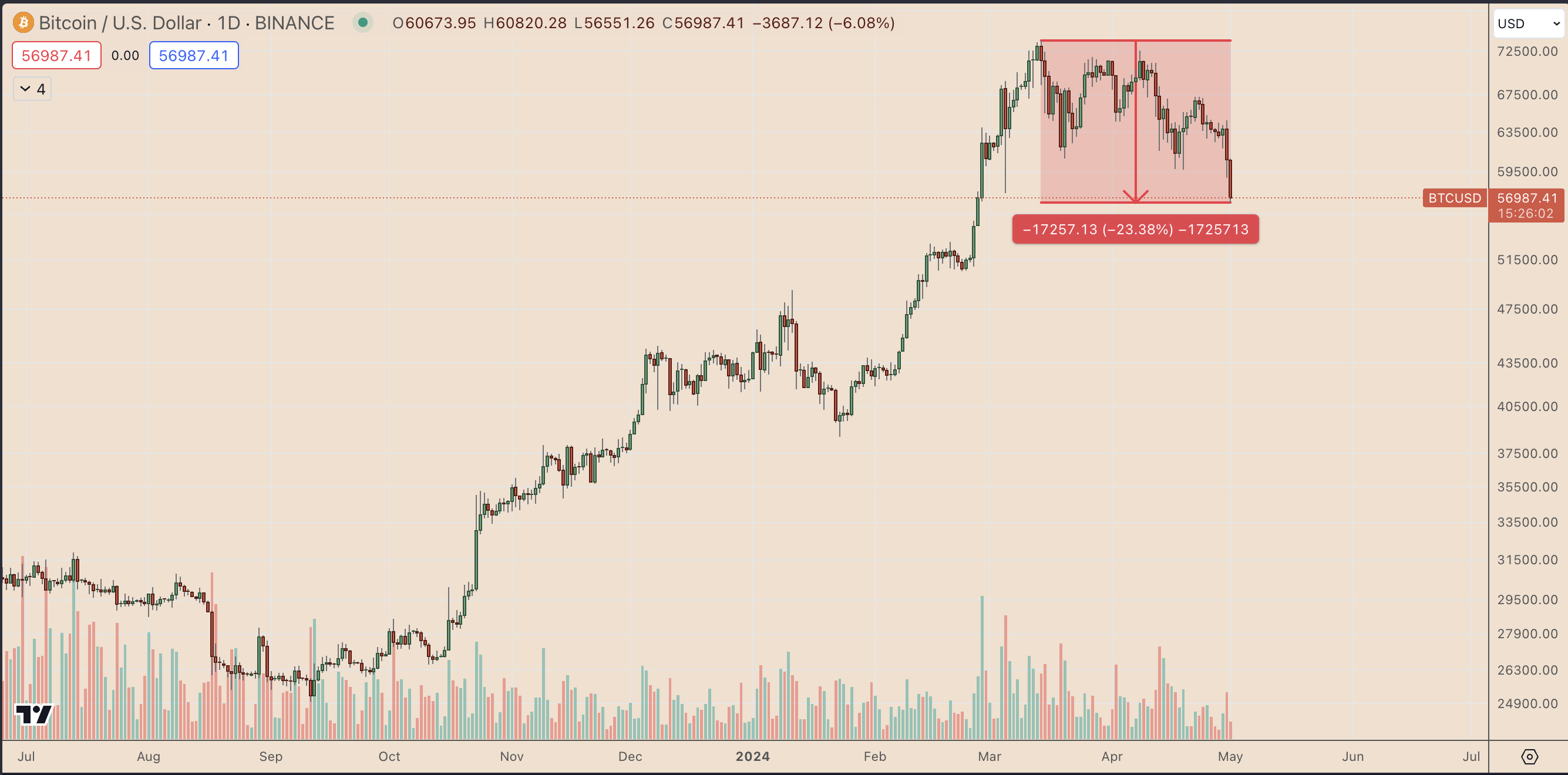Giá Bitcoin (BTC) đã giảm từ mức cao kỷ lục khoảng 73.800 USD trong hơn một tháng và hiệu suất của nó vào ngày 1 tháng 5 cũng không khác.