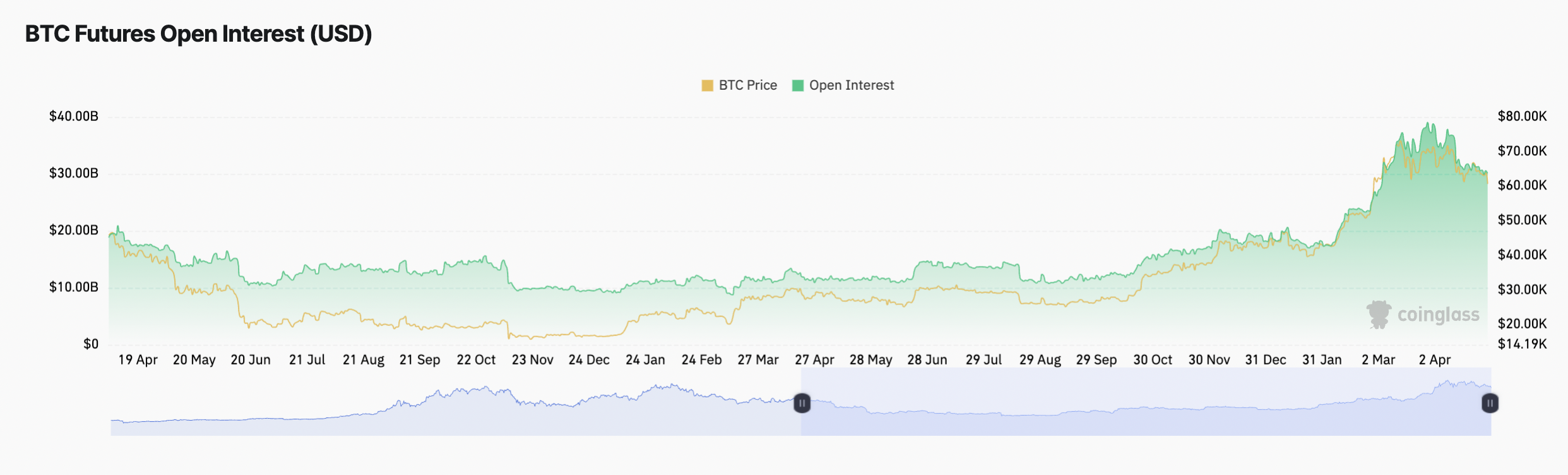 Lãi suất mở (OI) của Bitcoin đã ổn định ở khoảng 30 tỷ USD nhưng vẫn thấp hơn so với mức đỉnh năm 2024 là khoảng 39,30 tỷ USD.