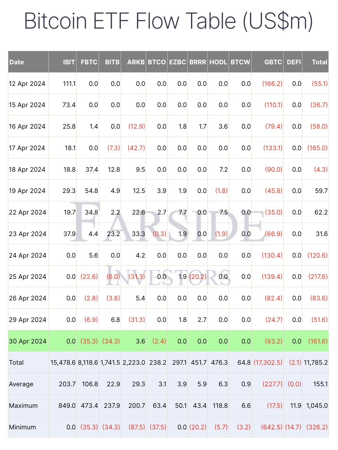 Tính đến ngày 30 tháng 4, các quỹ ETF này nắm giữ tổng cộng khoảng 1,178 tỷ USD, giảm khoảng 10% so với mức đỉnh cục bộ là 1,295 tỷ USD một tuần trước. Quỹ GBTC của Grayscale đã chứng kiến dòng tiền chảy ra liên tiếp trong giai đoạn nói trên, chủ yếu là do cấu trúc phí cao hơn.