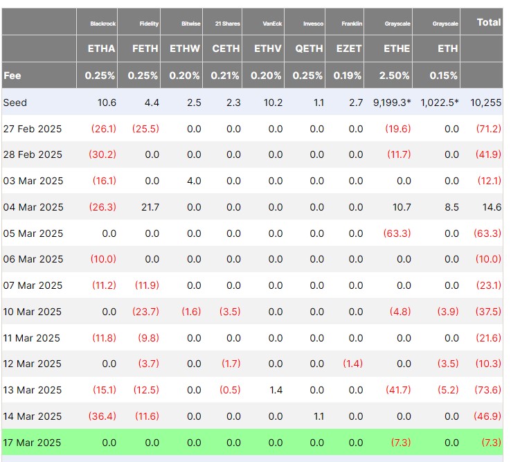Ether ETF có kết quả tiêu cực trong suốt tháng 3, ngoại trừ ngày 4 tháng 3, khi dòng tiền chảy vào đạt 14 triệu USD. Tuy nhiên, Ether ETF spot hoạt động kém trong phần còn lại của tháng 3, với tổng dòng tiền chảy ra hơn 300 triệu USD.