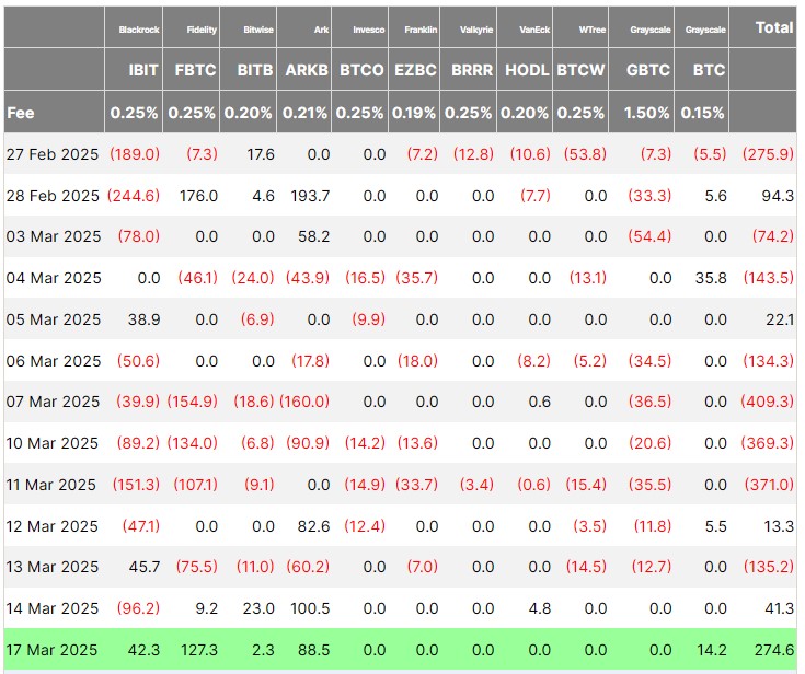 Nhìn chung, các quỹ Bitcoin ETF spot đã có tổng dòng tiền chảy ra hơn 1,6 tỷ USD trong 17 ngày đầu tiên của tháng 3 và chỉ ghi nhận 351 triệu USD dòng tiền chảy vào. Con số này không đủ để bù đắp cho khoản lỗ, đưa dòng tiền chảy ra ròng lên gần 1,3 tỷ USD.