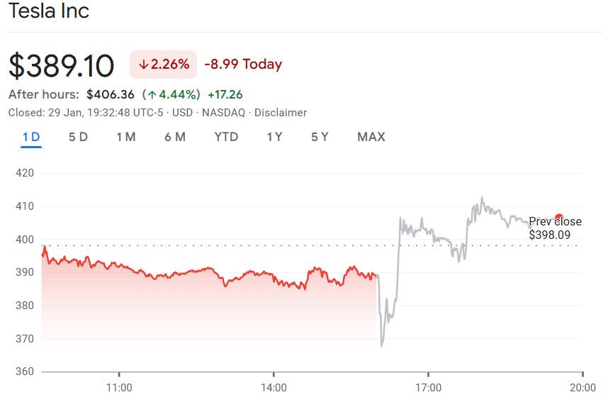 Theo Google Finance, cổ phiếu Tesla (TSLA) đóng cửa giảm 2,26% vào ngày 29 tháng 1 nhưng đã tăng 4,44% sau giờ giao dịch lên 406,36 USD.
