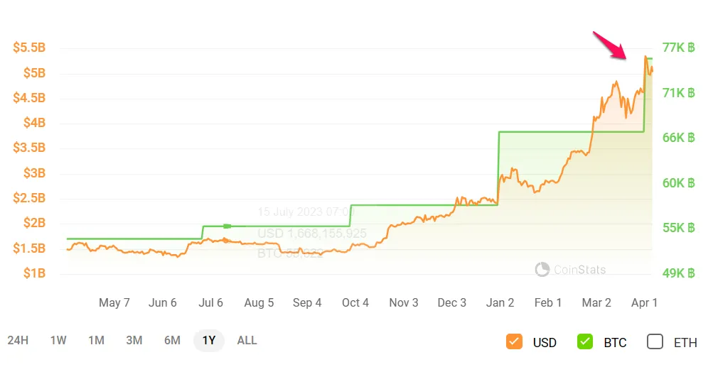 Hồi Q1/2023, Tether đã thông báo sẽ trích 15% lợi nhuận hằng tháng để phân bổ vào Bitcoin bên cạnh việc mua trái phiếu chính phủ. Và từ đó đến nay, biểu đồ cho thấy giá trị đầu tư của Tether tăng dần theo thời gian từ 1.5 tỷ USD lên đến hơn 5 tỷ USD.