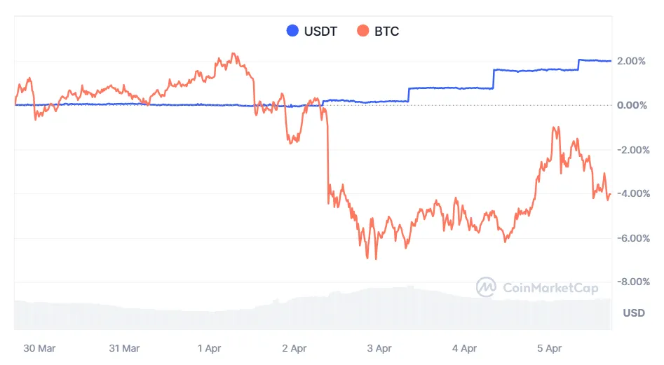 Dữ liệu từ CoinmarketCap cho biết, vốn hóa USDT trong tháng 4 đã vượt 106.6 tỷ USD, biểu đồ vốn hóa tăng lên từng “bậc thang” theo từng ngày.