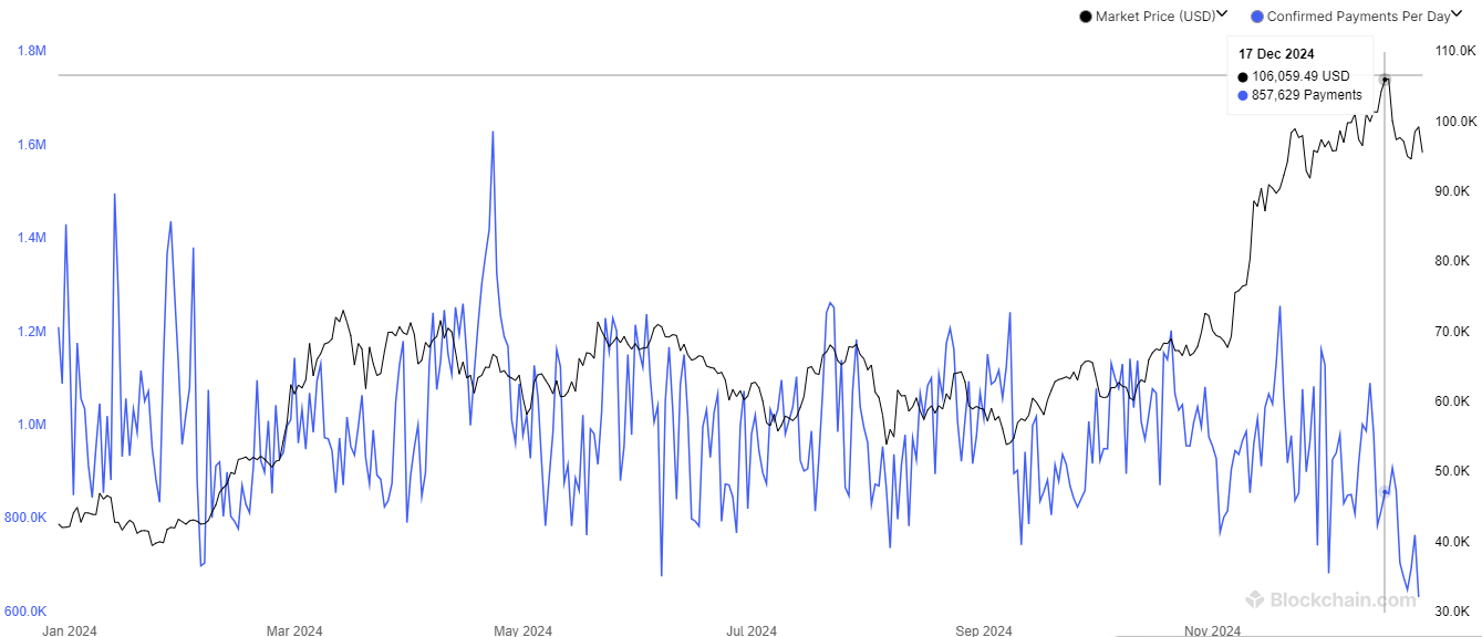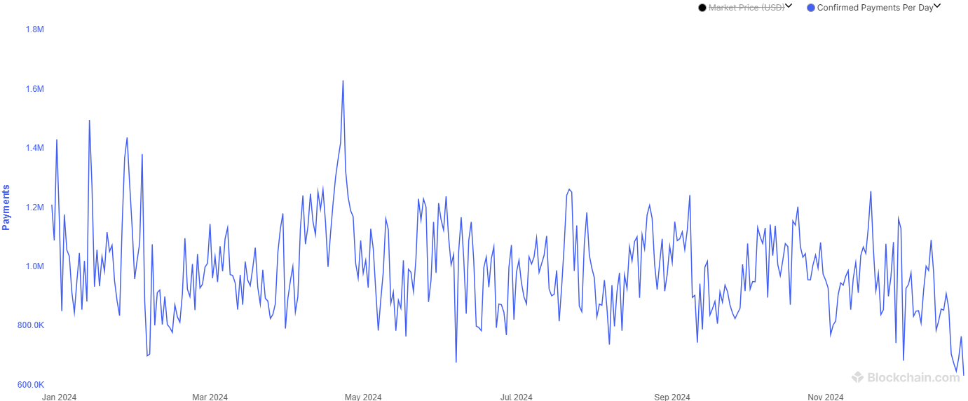 Thanh toán Bitcoin đã giảm xuống còn 623.434 vào ngày 26 tháng 12, đánh dấu mức thấp nhất trong năm, theo dữ liệu từ blockchain.com