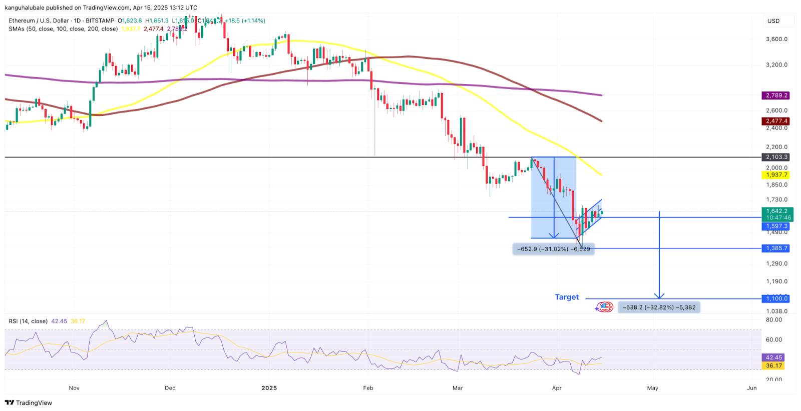 Chiều cao của cột cờ đặt ra mục tiêu, đưa mức giá tiềm năng giảm của Ether xuống còn 1.100 USD, tức là giảm 33% so với giá hiện tại.