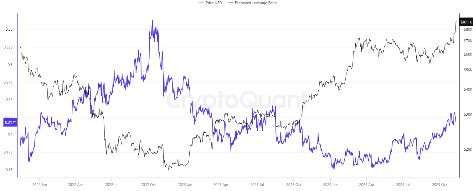 Dữ liệu của CryptoQuant cho thấy tỷ lệ đòn bẩy ước tính của Bitcoin trên tất cả các sàn giao dịch tiền điện tử là 0,217, đánh dấu mức cao nhất được ghi nhận vào tháng 10 năm 2023.