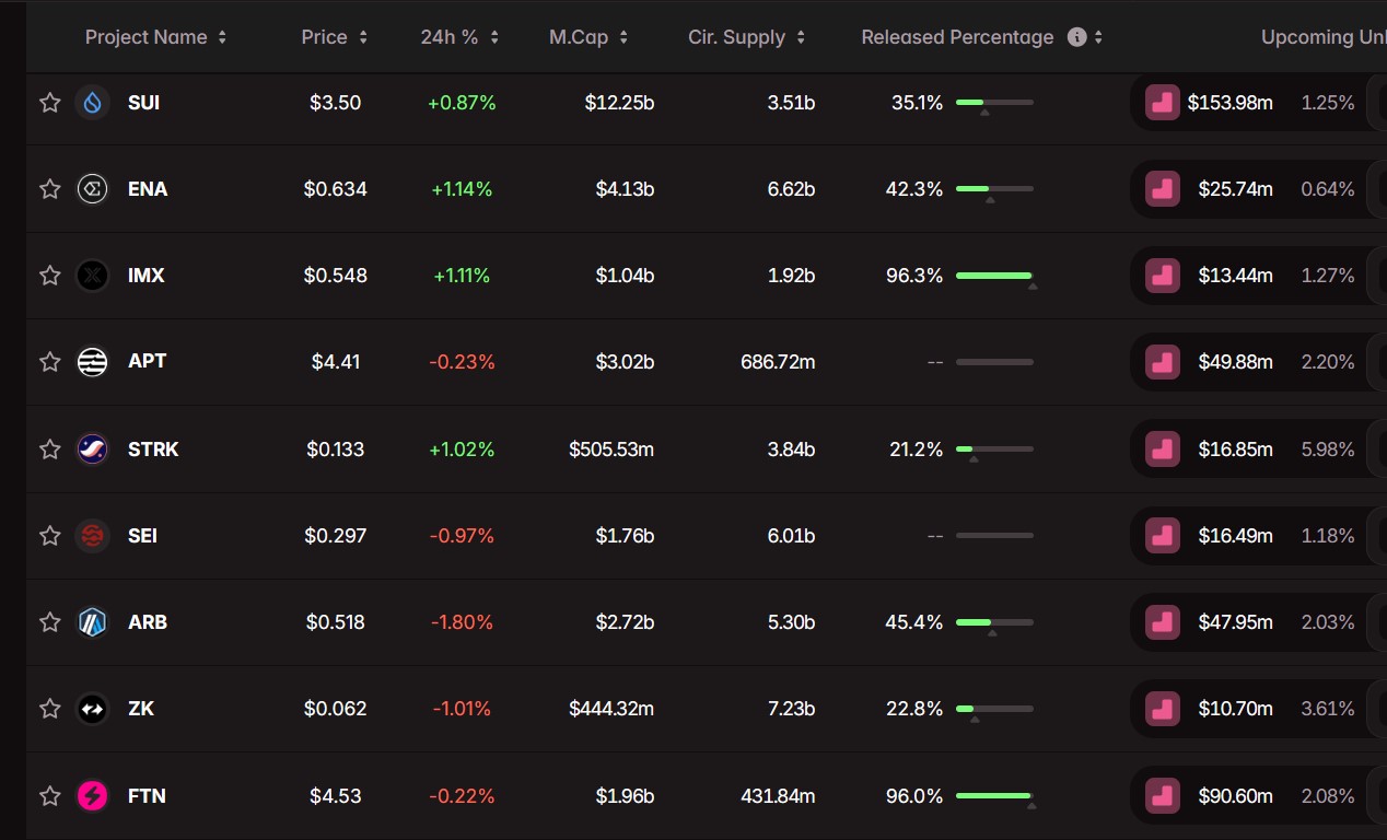 FTN đứng thứ hai với 90 triệu USD token được bổ sung vào nguồn cung. Không giống như Sui, FTN đã phát hành hơn 96% token của mình. Điều này có nghĩa là việc mở khóa này chỉ thể hiện mức tăng tương đối nhỏ hơn về nguồn cung.