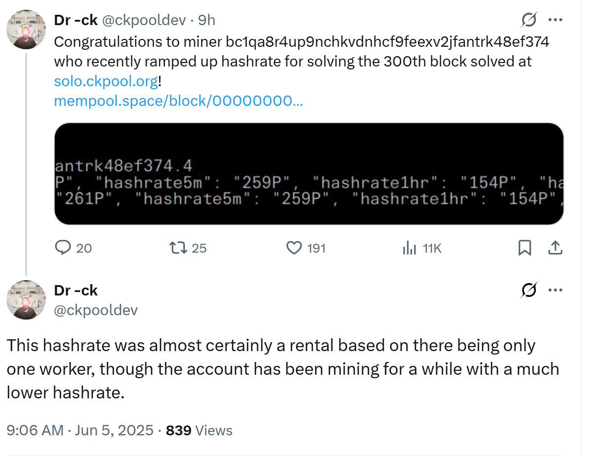 Trong một bài đăng ngày 5 tháng 6 trên nền tảng X, Con Kolivas – kỹ sư phần mềm kiêm quản trị viên của Solo CK mining pool – cho biết thợ đào giành được khối Bitcoin gần đây đã tăng tốc độ băm của họ lên 259 petahash mỗi giây (PH/s), một con số lớn bất thường.